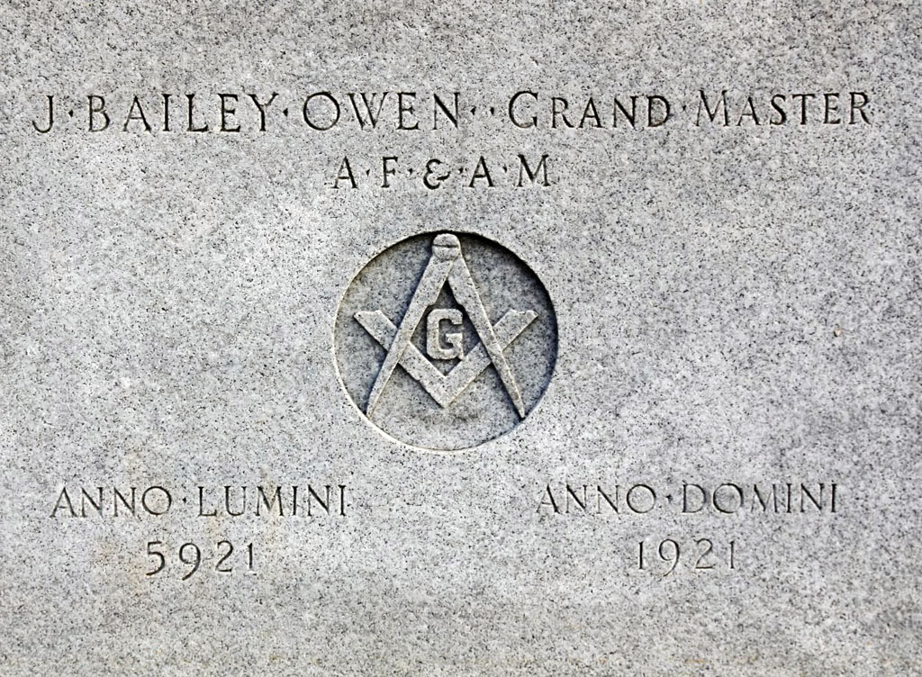 The cornerstone of North Carolina State University’s Bell Tower–laid and dedicated in November 10, 1921 by J. Bailey Owen, Grand Master of the Grand Lodge of Ancient, Free and Accepted Masons of North Carolina.